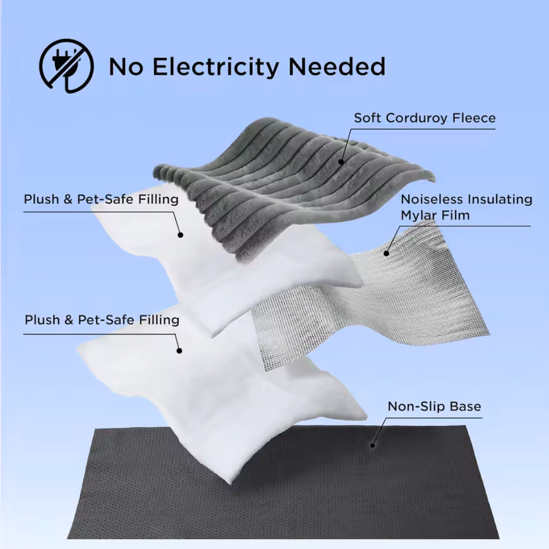 The WarmingMat uses a special heat-reflective mylar layer that absorbs and reflects your pet’s natural body heat. It keeps them warm and cozy without any cords, plugs, or power needed.